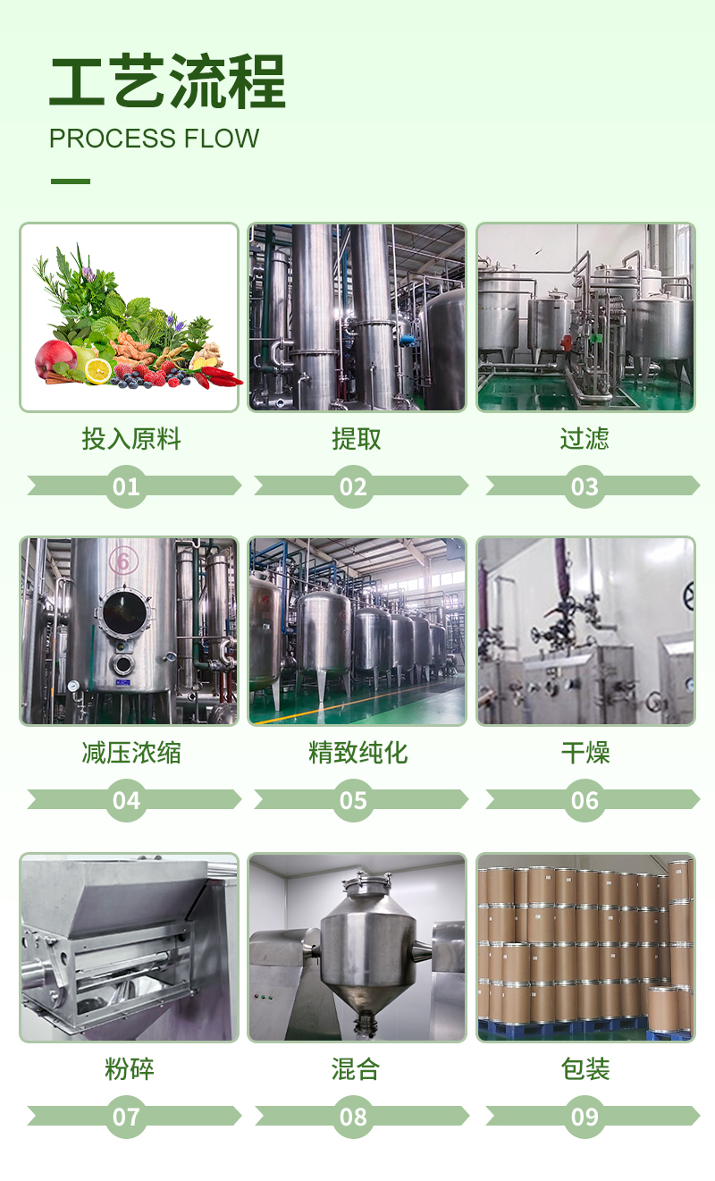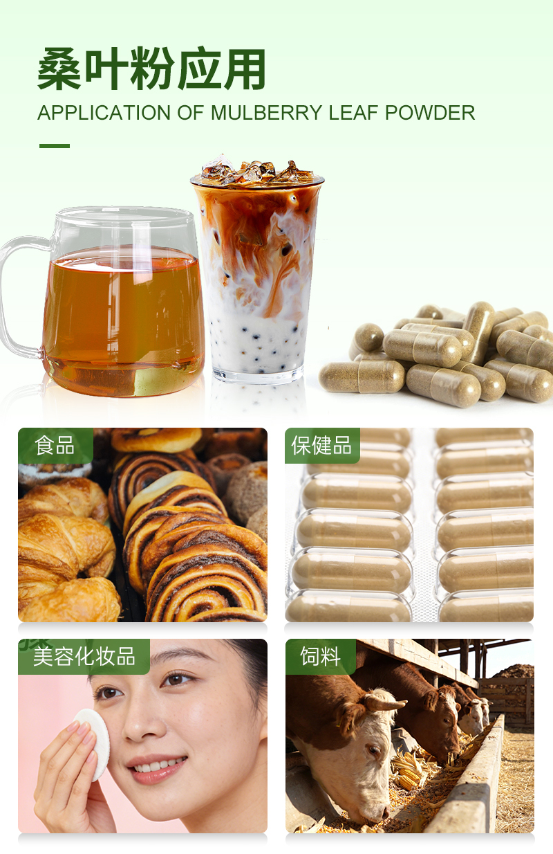 桑叶提取物以春蚕后期或霜降前桑树枝条上的第1~3位新叶加工的桑叶粉为原料,阴干,粉碎,分别用正丁醇、90%乙醇和水加温浸提,并喷雾干燥而得,提取物中含有桑叶黄酮、桑叶多酚、桑叶多糖、DNJ、GABA等多种生理活性物质。